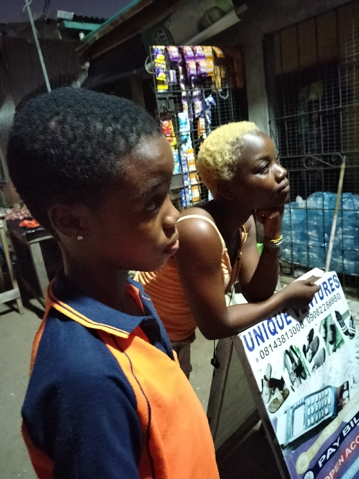 Two young women are standing outside. One is wearing a blue and orange polo shirt and a small earring. The other has short, blonde hair and is wearing an orange tank top. She is leaning on a sandwich board sign that says "Unique Futures" and has phone numbers listed. Behind them is a rack of packaged goods and some water bottles. The overall scene is dimly lit.