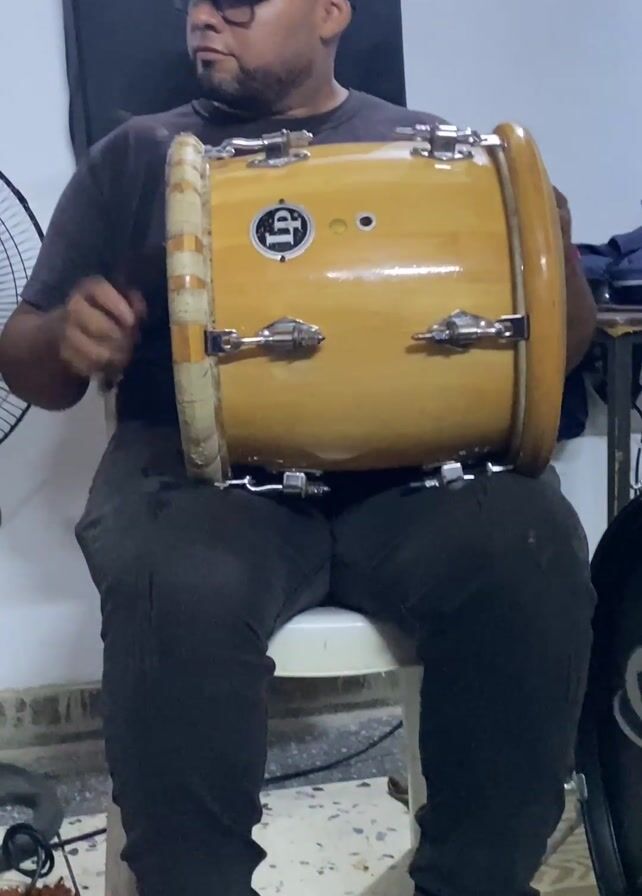 A medium shot shows a man playing a tambora drum while seated on a plastic chair