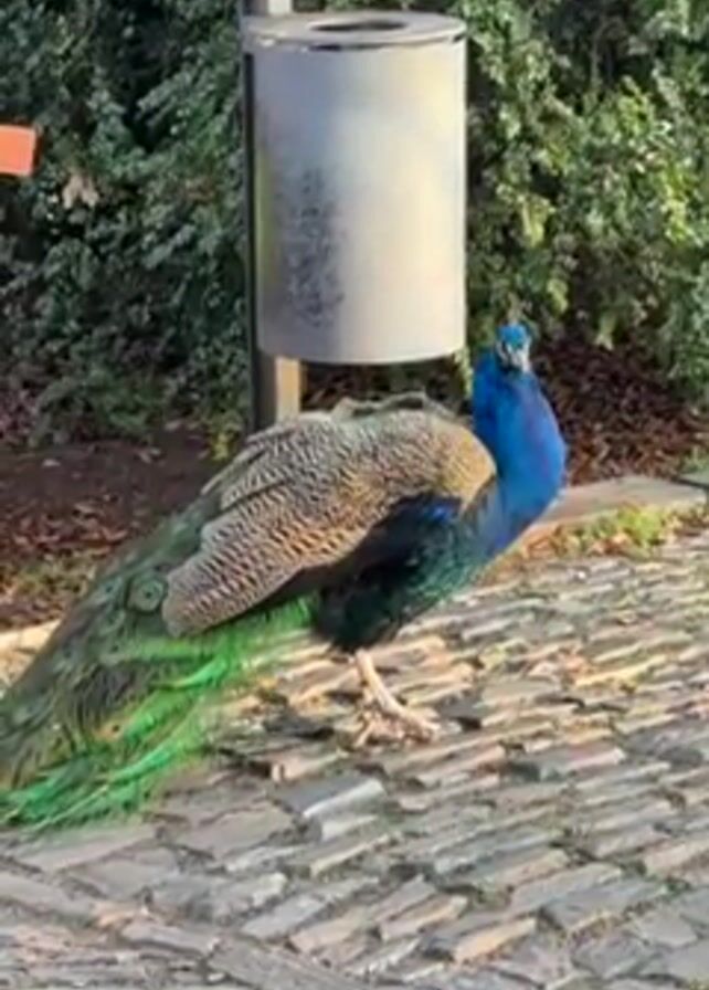 peacock standing on a cobblestone pavement. It is next to a silver trash can. Behind the trash can is a green leafy bush. The peacock's head is vibrant blue, and its body is a mix of brown, blue, and green. It looks around, tilting its head.