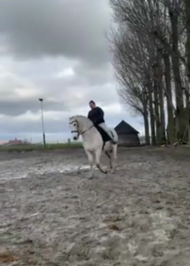 - "A woman rides a white horse in a muddy arena" by FM-xTDQG2, licensed under CC BY 4.0