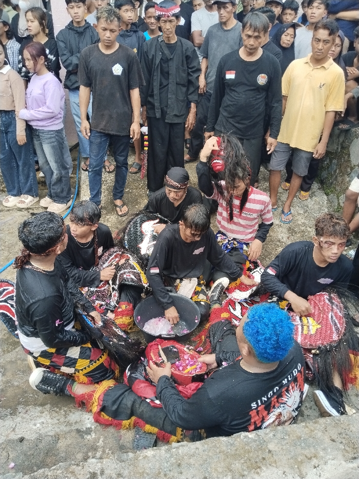 The image captures an outdoor scene in Kerjo, Indonesia, on a wet, light-colored concrete or stone surface. In the foreground, approximately seven male individuals are seated or crouched, dressed in black long-sleeved shirts, some featuring an Indonesian flag patch on the sleeve, and patterned traditional trousers in red, yellow, and black. Several wear red headbands, and their faces display dark smudges, with some exhibiting white linear markings. A black plastic bucket containing water and pink/white petals is positioned centrally among them, with one individual's hand submerged within. To the lower center, a male with vibrant blue curly hair, wearing a black shirt bearing the text "SINGO MUDO" and an emblem, holds a red, woven, patterned object. To the right, another individual in a red and white striped shirt holds a red mask with long dark hair above his head. Behind this seated group, a crowd of approximately 15 to 20 spectators, comprising various ages and genders in casual attire, observes the proceedings. A blue hose is visible on the wet ground to the left.