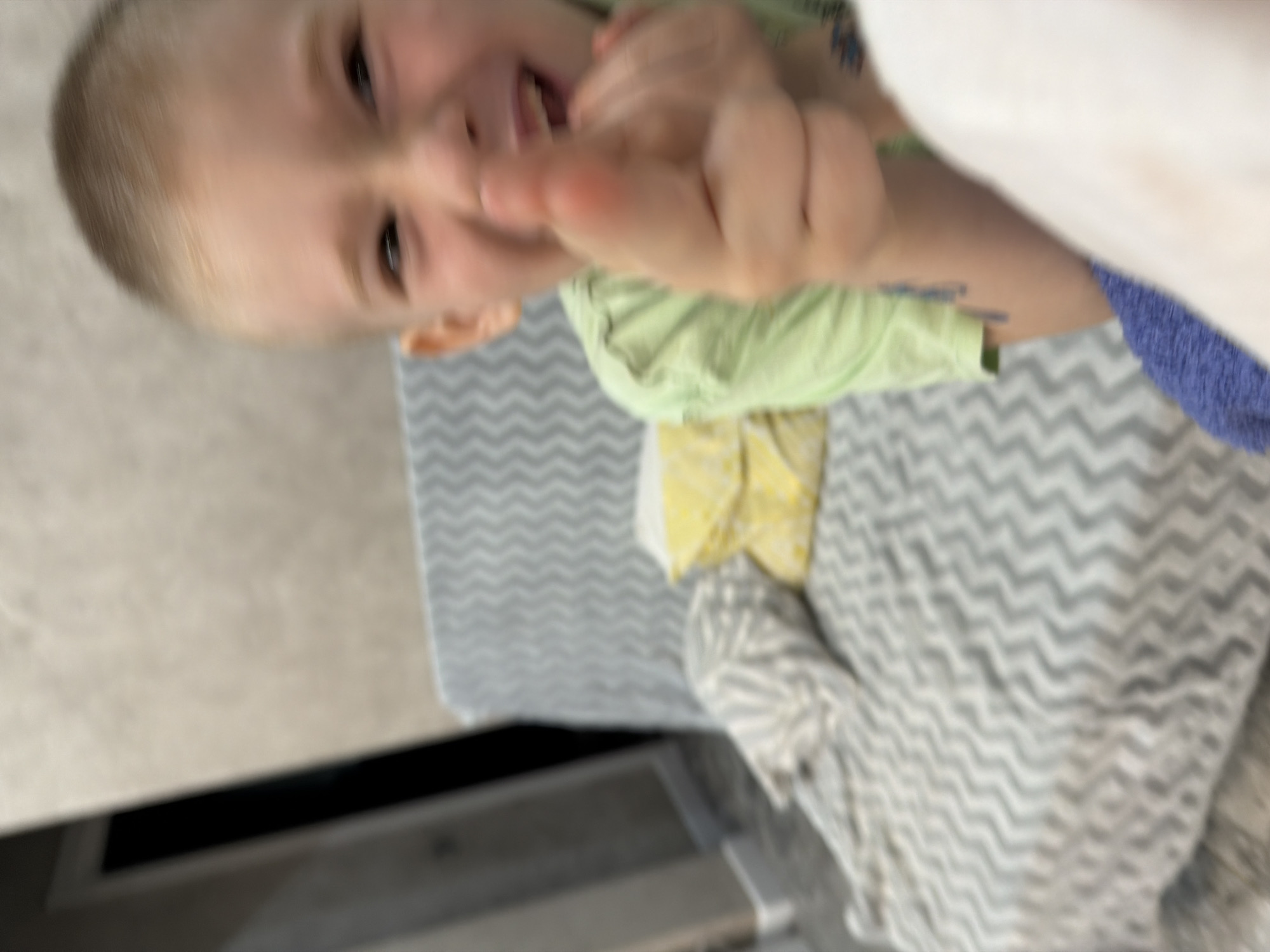 A young child is lying down in an indoor setting, possibly in Rossiyskiy, Russia. The child is wearing a green shirt and has light-colored hair. The background includes a gray and white chevron patterned surface and a kitchen countertop with an appliance below.