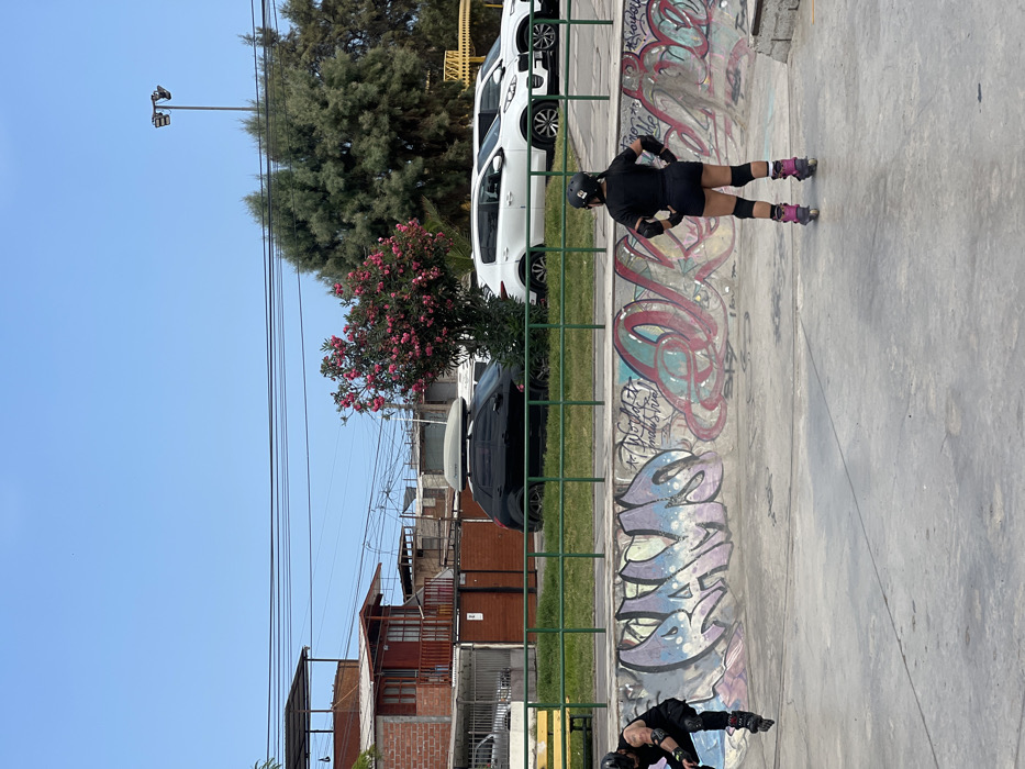 The image depicts an outdoor skatepark in Arica, Chile, under a clear blue sky