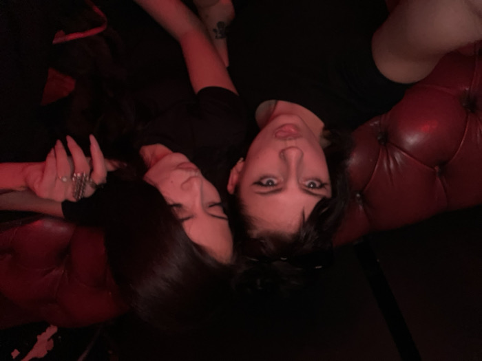The image depicts two adult females seated on a dark red, button-tufted leather Chesterfield-style sofa within a dimly lit indoor establishment, consistent with a lounge, bar, or club setting typically found in the city of London, United Kingdom. The environment is bathed in a pronounced red light, casting a vibrant hue across the subjects and seating. The female subject on the left, positioned in the foreground, has dark hair, a visible septum piercing, and prominent eyeliner. Her head is angled slightly to the right, and her lips are pursed with her tongue partially extended in a playful expression. She is wearing a black short-sleeved top and her left arm is raised, suggesting she is holding the camera to take a selfie. The female subject on the right, positioned slightly behind the first, has long dark hair. Her head is tilted downwards, with her eyes closed or looking away, and her lips are pursed in a kissing gesture. She is wearing a black top or dress, and multiple rings are visible on the fingers of her right hand, which appears to be resting on the shoulder of the other subject or the back of the sofa. The interaction suggests a casual, friendly pose for a photograph.