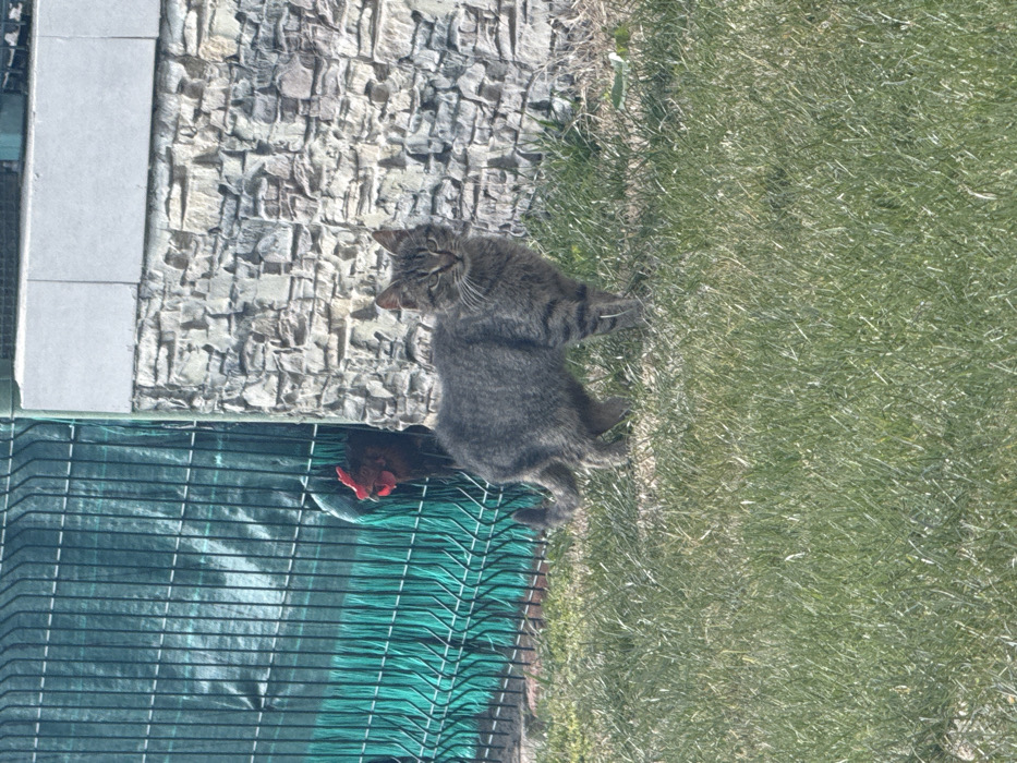 The scene depicts an outdoor area in Sadievo, Bulgaria, under direct sunlight. In the midground, a short-haired tabby cat, grey-brown with darker stripes, stands on green grass. The cat faces slightly right but looks directly at the camera, with its tail curved upwards. Behind a green wire mesh fence, covered by a green privacy screen to the left of the cat, the head and partial body of a dark-feathered chicken with a prominent red comb are visible. To the right of the fence and behind the cat, a wall constructed from light-colored, irregular stone veneer is present, topped with a light grey coping. The foreground consists of green grass with some dry patches. No human figures are present.