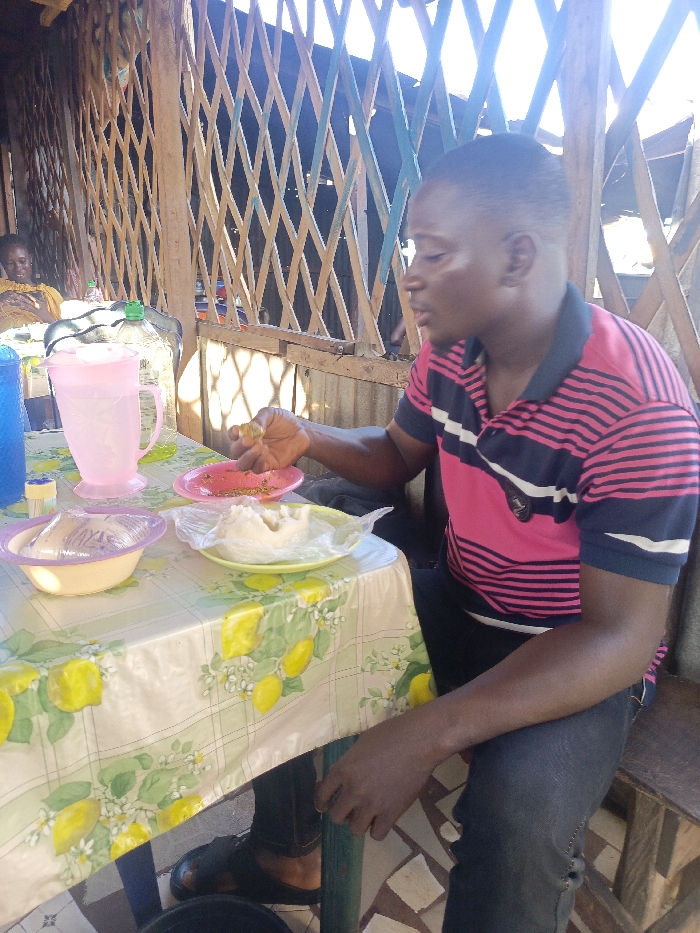 This image depicts a man eating a meal inside an open-air eatery in Lafia, Nigeria