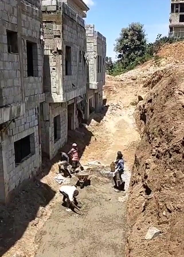Workers are paving a path between buildings under construction on a sunny day. Four men are visible in the shot working in the pit. One is bent over, working on the ground, another has his hands on a wheelbarrow. The third is holding a pail, and the fourth is standing, looking in the direction of the camera. The walls of the building are visible on the left of the shot, and the dirt wall of the pit is on the right.