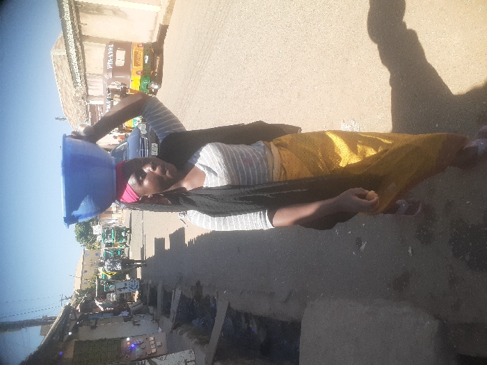 The image depicts a street scene in Jos, Nigeria, under bright daylight with a clear blue sky. In the foreground, an adult female is walking forward, slightly angled towards the camera's left. She wears a pink headwrap and balances a large, empty, blue plastic bowl on her head, stabilizing it with her raised left hand. Her attire consists of a light-colored, horizontally striped short-sleeved top, a dark-colored shawl draped over her shoulders, and a patterned yellow wrapper/skirt. She wears light-colored flip-flops. To her immediate left, a narrow concrete-lined drainage ditch filled with dark fluid and debris runs parallel to the walking path. Structures appearing to be shops or stalls line the left side of the street, with one displaying colorful, possibly LED, lights. In the mid-ground on the left, indistinct figures of people are visible walking. The street surface is unpaved or lightly paved, appearing dirt-colored. Long shadows are cast on the ground to the right of the primary subject. On the right side of the street, a dark-colored sedan is visible. Further down the street, multiple auto-rickshaws (Keke Napep) are present; one prominent unit is yellow, green, and red, displaying the license plate or identification "PTM-47HG" on its rear. Buildings with light-colored walls and low roofs line the right side of the street in the background.