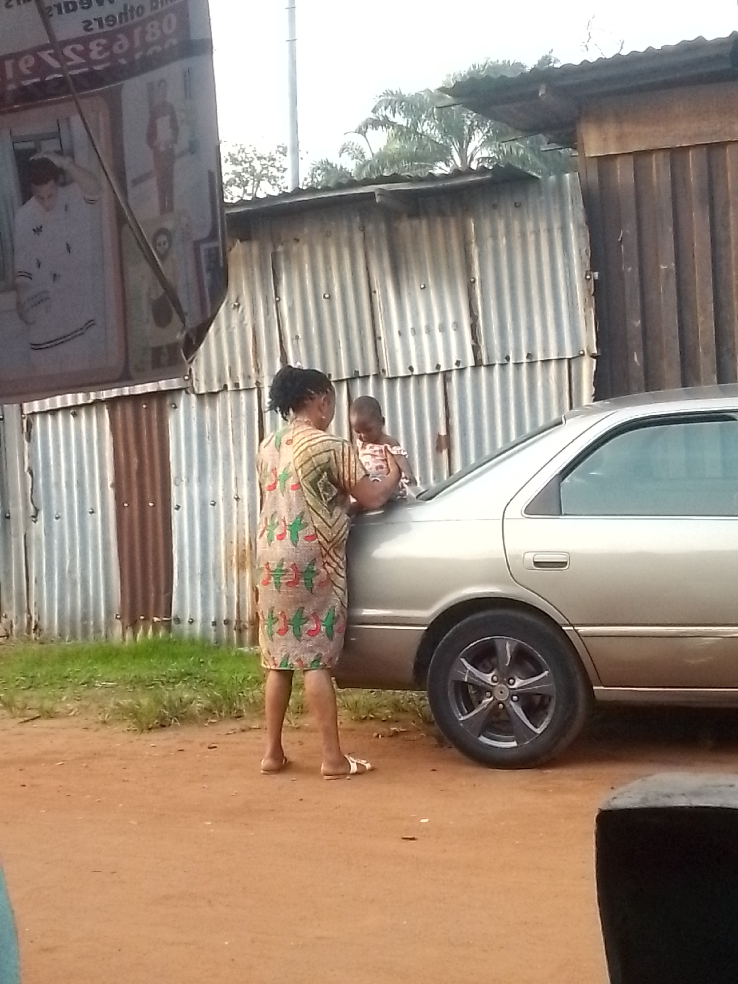 woman standing next to a gold sedan with a baby seated on the trunk. The woman is wearing a colorful dress and white sandals. The car is parked on a dirt surface, with green grass in the background. Behind the car is a corrugated metal wall, indicating a possibly urban or semi-urban setting. A large sign is visible to the left of the car, partially obscuring the view. The location appears to be in the city of Unknown, Unknown.