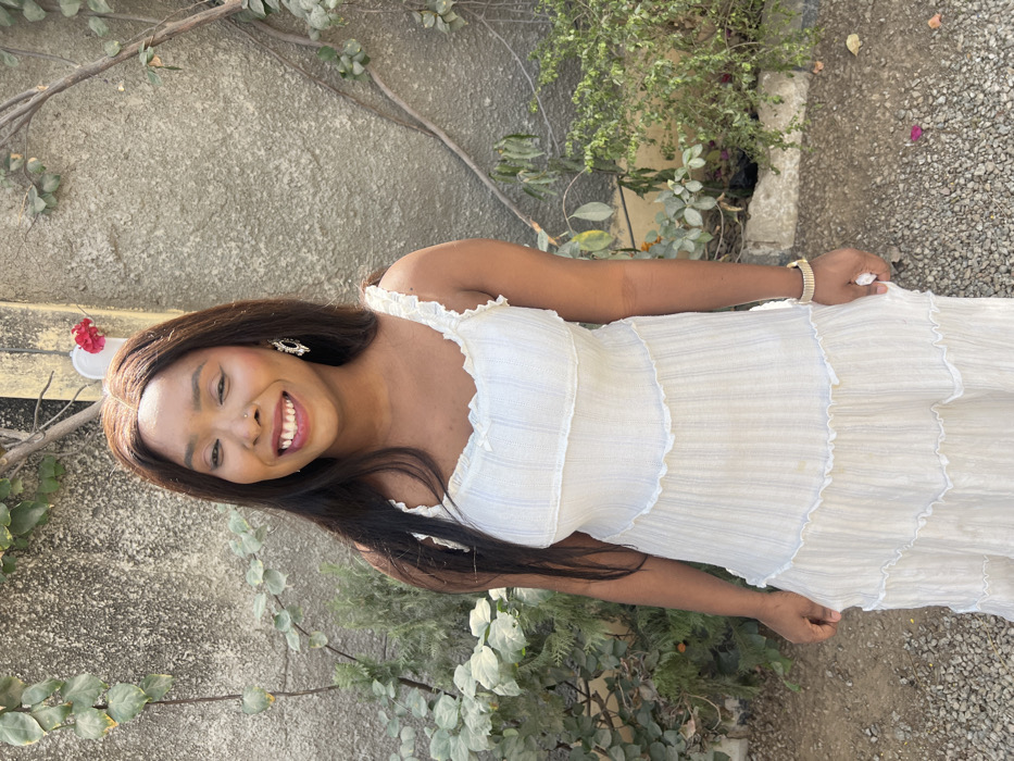 An adult female is depicted standing outdoors in Giginyu, Nigeria, positioned centrally against a textured grey concrete wall. The wall is partially obscured by green foliage, including climbing vines and shrubs. The subject, of Black African descent, has long, dark brown hair, a broad smile revealing her teeth, a small silver nose piercing on her left nostril, and large, ornate silver-colored drop earrings. She is wearing a light-colored, tiered maxi dress with thin shoulder straps and a textured fabric. A gold-colored wristwatch is visible on her left wrist. Her hands are positioned near her hips, lightly holding the dress fabric. The ground in the foreground is composed of gravel and sparse vegetation. Natural daylight illuminates the scene.