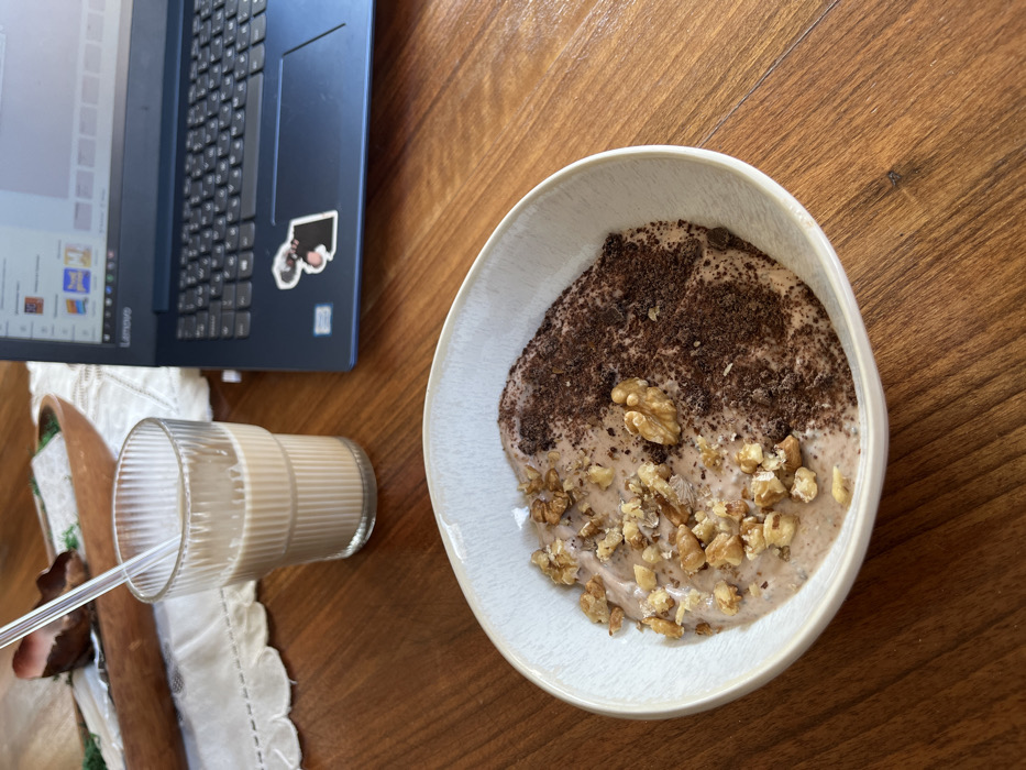 A tabletop scene is depicted in Samovodene, Bulgaria. A light-colored ceramic bowl in the foreground contains a two-sectioned dish: one half is topped with irregular pieces of walnuts, while the other is covered with dark brown, granular material, likely cocoa or grated chocolate. A single whole walnut piece rests near the division of these toppings. To the upper left, a clear, vertically ribbed glass holds a light brown, opaque liquid, possibly a beverage like iced coffee or a latte, with a clear plastic straw inserted. To the upper right, a dark blue Lenovo laptop is open, displaying a screen with various icons and what appears to be a web browser. A white sticker featuring a stylized black figure is affixed to the laptop's palm rest. All items rest on a polished wooden surface with a visible grain. A white, embroidered fabric piece is partially visible beneath the glass and extending left. In the upper left background, a portion of a shallow, elongated wooden decorative bowl containing some green and dark brown elements is visible. No individuals are present in the image.