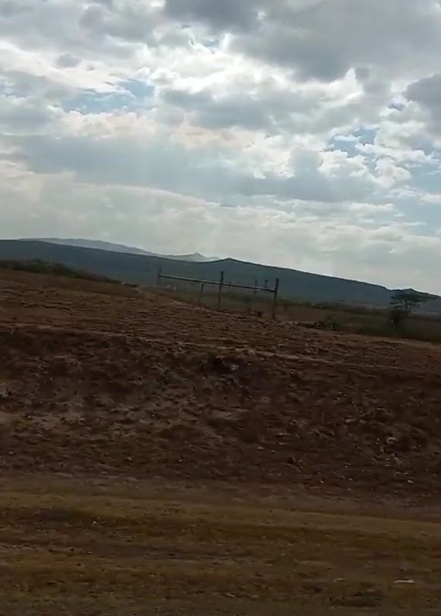 landscape with a brown, mostly barren field in the foreground. There are a few scattered trees visible in the middle ground. In the background, there are low, rolling hills or mountains. The sky is overcast with patches of blue sky visible between the clouds. The camera appears to be moving, possibly from a vehicle. There is music playing in the background.
