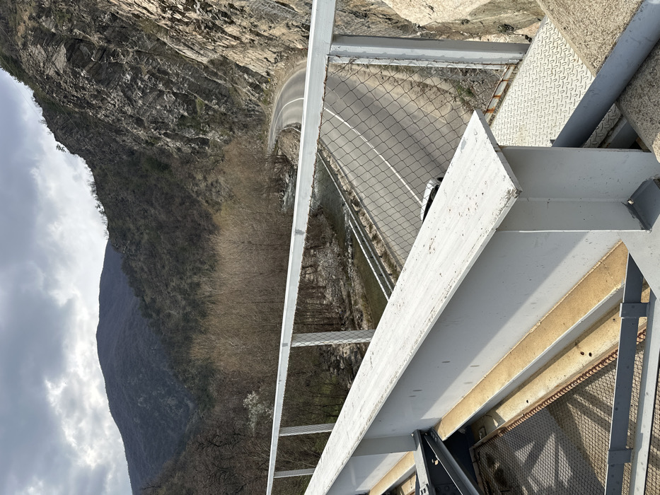 The scene depicts a mountainous valley located in the city of Vetren Dol, Bulgaria, viewed from an elevated perspective, likely from a bridge or structural platform. In the immediate foreground, a light gray metal I-beam girder is prominent, forming part of a structural element, with additional metal grating and support beams visible below it. A light gray metal railing with a chain-link fence section extends across the mid-foreground, serving as a barrier. Below the railing, an asphalt road with a solid white center line curves through the valley, following the base of a steep, rocky mountain face on the right. A metal guardrail runs along the road's edge. A river or stream flows along the valley floor to the left of the road, bordered by dry, deciduous trees and shrubs, some displaying sparse green foliage and white blossoms. The background features rugged mountains: a steep, geologically stratified rock face on the right, and tree-covered peaks in the distance to the left. The sky above is overcast with visible cloud cover. No individuals or active subjects are present within the visible area.