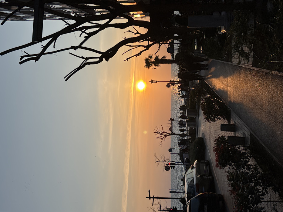 The image captures a sunset scene over the Nea Paralia waterfront promenade in the Thessaloniki Municipal Unit, Greece. The sun, a bright orange orb, is positioned low on the horizon, casting a strong, warm light across the sea and foreground surfaces. The sky transitions from a vibrant orange at the horizon to a pale blue overhead, with faint cirrus clouds visible. In the background, the dark blue Aegean Sea is moderately choppy. A large, dark-hulled sailing ship, possibly a replica, is visible on the water, slightly left of center. Along the waterfront, a pedestrian promenade is occupied by numerous individuals and small groups of people, largely silhouetted, walking and standing. Traffic signals showing red lights are visible at intervals along the waterfront. A two-lane road runs parallel to the promenade in the midground, with several dark-colored vehicles parked or slowly navigating on the left side. The foreground features a paved sidewalk on the right, strongly illuminated by the sun's low angle, creating a path of bright orange reflection. This sidewalk is bordered by planted areas containing dark shrubs with reddish foliage and several deciduous trees with bare, starkly pruned branches, silhouetted against the sky and a nearby building. A single palm tree stands near the center-right. Urban elements include an ornate streetlamp pole, dark bollards, and waste receptacles. On the far right, a dark bust rests upon a light-colored pedestal. A multi-story building, appearing dark in silhouette, frames the right side of the image, with some windows reflecting the sunset's light. People are observed walking on the sunlit sidewalk in the foreground, casting long shadows.