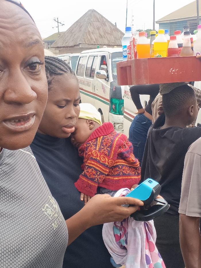 This image depicts a bustling street scene in Owerri, Nigeria. In the immediate foreground, the right eye and lower face of a dark-skinned woman wearing a grey, textured shirt are visible, her mouth slightly agape. Adjacent to her, a young dark-skinned woman with braided hair, dressed in a dark top, cradles a baby. The baby wears a red and orange patterned knitted sweater, a light yellow cap, and small gold earrings, appearing to be asleep or resting. A hand, possibly belonging to the foreground woman, holds a turquoise blue portable point-of-sale (POS) device over a multicolored patterned cloth. In the midground, a white commercial passenger van with a green and red stripe and partial "MASS" lettering is parked. Behind the van, several indistinct figures are present. One individual balances a red tray laden with assorted bottled beverages, including water and various juices, on their head. The background features buildings with corrugated metal roofs, one distinctly conical or pyramidal, alongside utility poles and wires under an overcast sky.