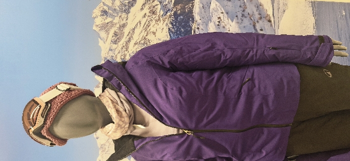 The scene, located in Vendin-le-Vieil, France, features a retail display with a single mannequin, partially visible from the waist up. The mannequin is faceless and grey, adorned with a light pink knitted beanie. Brown-tinted ski goggles with a white strap are positioned over the beanie. Around the neck, a light-colored, patterned scarf is loosely wrapped. The mannequin wears a light grey top visible beneath a purple ski jacket. The jacket features a black central zipper, a zippered chest pocket on the left, and a zippered pocket on the left forearm. Adjustable cuffs are present. Dark grey or black ski pants with a light-colored logo on the right thigh are visible below the jacket. The background consists of a large photographic print depicting a snowy mountain range under a light blue sky, simulating an outdoor winter environment.