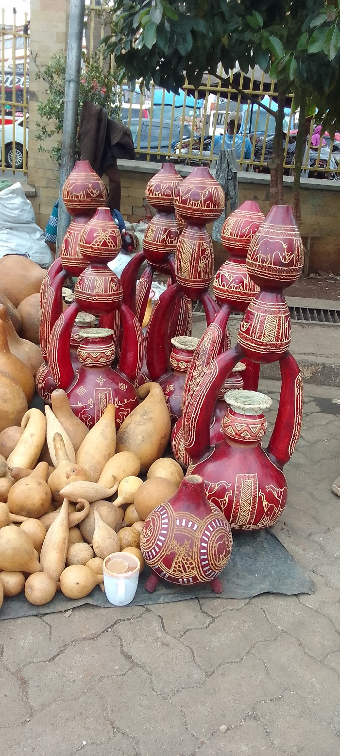 The image depicts an outdoor market scene in an urban environment of Unknown, Unknown, primarily focused on a display of gourds. In the immediate foreground, a light-colored ceramic mug containing a brown liquid rests on gray interlocking paver stones. To the left, a large pile of natural, light brown gourds of various shapes and sizes (elongated, pear-shaped, round) are arranged on a dark fabric spread on the ground. To the right of these, a collection of dark red, highly decorated gourds are displayed. These gourds are intricately carved or painted with light-colored patterns, including depictions of elephants, giraffes, and rhinos. Some are simple vase-like shapes, others feature prominent handles, and several are stacked in multiple tiers. Many of these decorated pieces have woven straw rings around their openings. In the midground, behind the gourd display, a white plastic sack is visible. A gray metal pole stands vertically on the left. Two individuals are partially visible in the background: one figure in dark brown clothing is obscured by the gourds and pole on the left, facing away, and another person wearing a light blue shirt and a light-colored cap is visible on the right, partially behind a yellow metal fence. The background reveals a yellow metal fence with vertical bars. Beyond the fence, several vehicles are present, including a white car on the far left. Blue tarpaulins or covers are discernible in the distance, suggesting additional market stalls or temporary structures. Overhanging green tree foliage covers the top portion of the image. The ground in the further background appears to be uneven dirt or pavement, with a concrete drain visible on the far right.