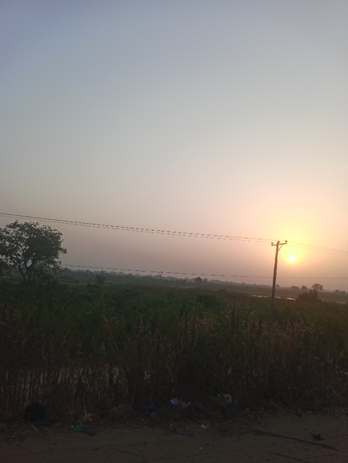 The sun rises over a rural landscape. Tall grass and scattered vegetation fill the foreground, transitioning into a field. A solitary tree stands to the left. Power lines stretch across the scene, leading to a utility pole silhouetted against the rising sun. The sky is light, a gradient of pale blue to orange near the horizon. Debris litters the lower edge of the frame.
