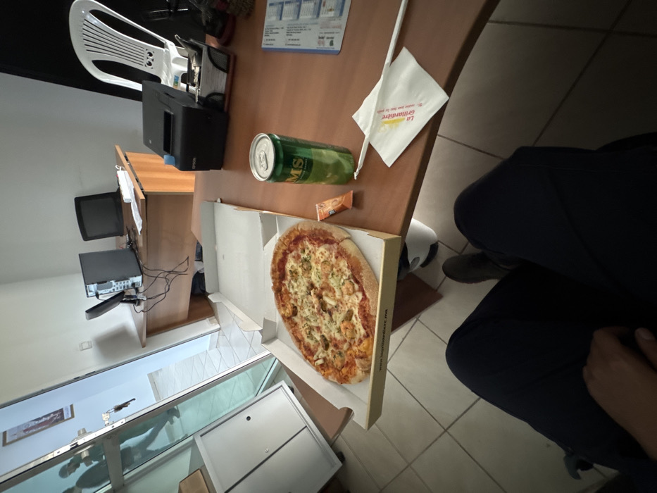 An indoor scene in Douyet, Morocco, depicts a person's seated perspective at a brown wooden desk. In the immediate foreground, a person's legs in dark trousers and dark shoes are visible. On the desk, a circular pizza with visible shrimp and other toppings rests in an open white cardboard box, which features "www.lagrillardiere.ma" branding. Adjacent to the pizza is a green aluminum can, an orange condiment packet, a white napkin with "La Grillardiere" branding, and a white plastic straw. The background shows an office environment with white walls and a light-tiled floor. A second, lighter-wood desk is perpendicular to the first, holding a desktop computer tower, two monitors (one CRT, one flat-panel), and an Epson printer. A white plastic slatted chair is positioned behind this second desk. To the left, a silver-colored cabinet is partially visible. A glass doorway reveals a hallway or exterior area where two blurry human figures are reflected, appearing to walk past. Keys hang from the doorframe. A framed picture is visible on a wall through the doorway.