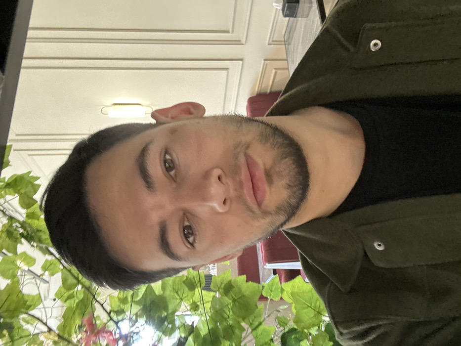 A young man with dark hair and a trimmed beard poses for a selfie. He's wearing a black shirt under a green jacket with visible metal buttons. He looks directly at the camera with a neutral expression. Behind him, there's a wall with framed panels and a horizontal light fixture. Artificial vines with green leaves are visible in the foreground. A hint of a red chair and a black object can be seen further in the background. The photo appears to be taken indoors with relatively soft lighting.