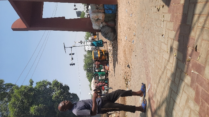 The image displays an outdoor street scene in Zango, Nigeria, under a clear blue sky. A bald adult male, wearing a blue polo shirt, dark trousers, and blue slide sandals, stands in the left foreground on a reddish-brown and light-colored interlocking brick sidewalk. He faces left, holding a small, indistinct object in his hands. The paved sidewalk transitions to a dirt road in the midground, which is littered with debris including leaves and plastic. In the mid-distance on the dirt road, multiple individuals are present, some congregating near several motorized tricycles. A yellow tricycle is visible centrally, flanked by at least two green or blue tricycles. A person in a vibrant blue garment stands to the right of the yellow tricycle. Overhead, multiple black traffic signal heads, some equipped with solar panels, are mounted on poles, indicating an intersection. Overhead power lines are also visible against the sky. On the far right, a tall, reddish-brown angular architectural structure is prominent, against which a stack of large, bundled sacks (white, grey, and blue) is resting. A dense green tree canopy is visible on the left side of the frame.