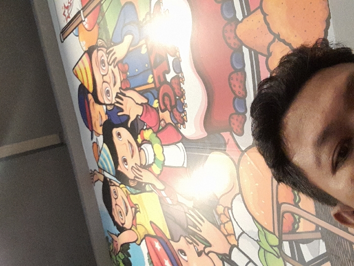 An upward-angled, close-up indoor photograph captures a vibrant cartoon mural on a wall, with the upper portion of a human head in the foreground