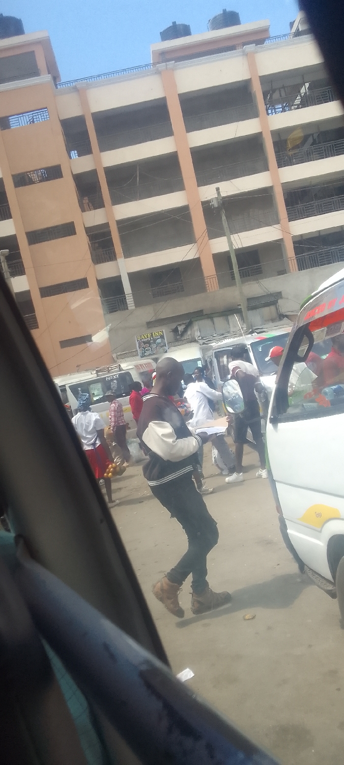 The image displays an urban street scene in Viwandani ward, Kenya, captured from inside a vehicle on a clear day. The foreground features a partial view of a dark interior car frame on the left. In the middle ground, a bald adult male, wearing a dark jacket with white sleeves, black trousers, and light brown boots, walks left-to-right, holding white papers or documents in his left hand. To his left and slightly behind, an adult female with a blue head covering, white shirt, and red skirt carries a net bag containing oranges. Multiple other individuals, primarily male, are present, some congregating around white minibuses (likely matatus). One individual in a white shirt and dark pants is also seen holding papers. A white minibus partially occupies the right foreground, exhibiting yellow body markings and a side mirror. The background is dominated by a multi-story building, at least five floors high, with a distinctive peach-colored facade and recessed beige sections, indicative of balconies or windows. Black water tanks are visible on its rooftop against a clear blue sky. Below this building, a utility pole with multiple overhead wires stands. A commercial sign for "SAVE INN CHIPS & FISH" is discernible on a lower structure, indicating a food establishment. Another sign displaying "NEXT" is visible on the side of a white minibus in the middle distance. The overall environment suggests a bustling commercial and transportation hub.