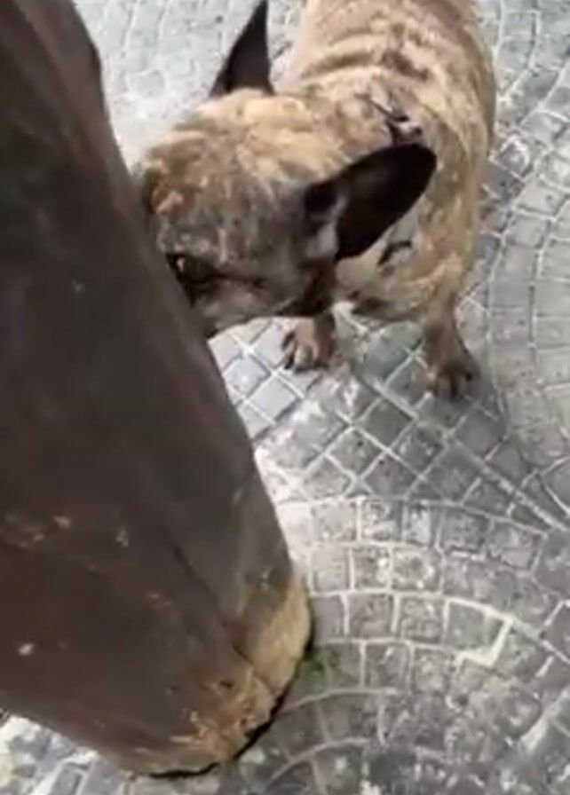 - "brindle French Bulldog on a patio made of tiles arranged in a circular pattern" by FM-Ucqa63, licensed under CC BY 4.0