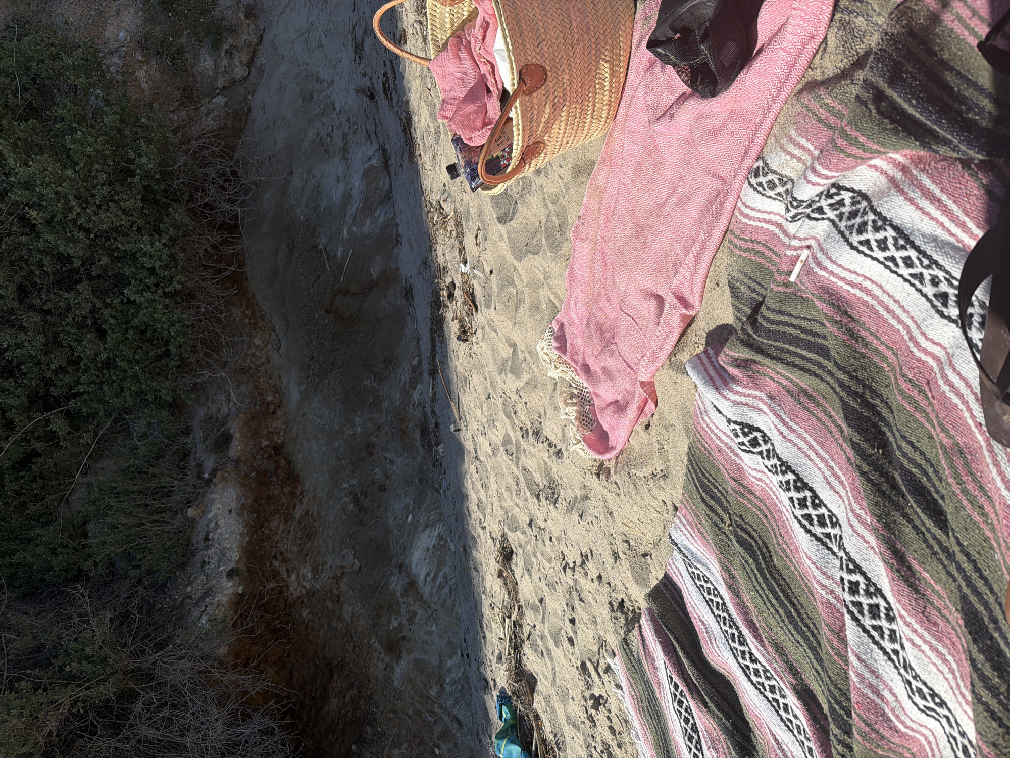 The image depicts a scene at the beach in Malibu, United States of America. A sandy area is covered with a striped blanket, a pink towel, and a straw bag. Part of a cliff with vegetation is on the left side of the image. The items suggest a day at the beach.