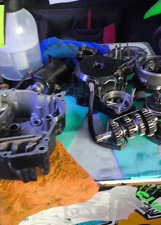 disassembled engine of a motorcycle. The parts are laid out on a workbench covered with stickers. A green and black motorcycle stands nearby, partially disassembled. The engine casing, gears, and other components are visible, suggesting the engine is being repaired or rebuilt. The environment appears to be a garage or workshop.