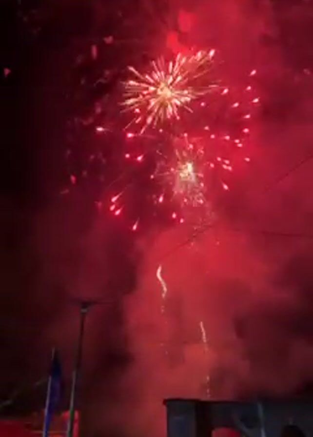 fireworks display at night. Explosions fill the sky with streaks of white, green, and red. There is a lot of smoke. In the foreground are silhouettes of buildings and a crowd of people. A blue flag waves on a pole. A street lamp stands near the crowd.