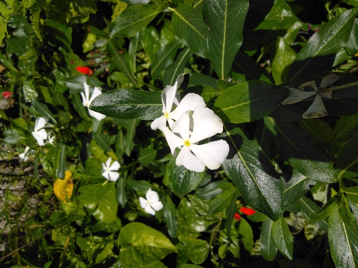 The image displays a close-up view of multiple white flowers with five distinct petals and bright yellow centers, resembling Catharanthus roseus (Madagascar periwinkle). These flowers are set against a backdrop of dense, vibrant green foliage, composed of numerous glossy, ovate leaves. Sunlight illuminates the scene, creating areas of shadow on some of the leaves, particularly on the lower right side. Interspersed within the green foliage, particularly in the background, are minor elements including a small cluster of yellowish leaves and two isolated instances of vivid red, possibly small flowers or berries. The scene represents an outdoor floral arrangement, located in the city of Oslo, Norway. No individuals or man-made objects are present.