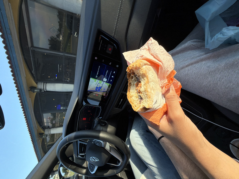 Inside a car, a hand holds a partially eaten sandwich wrapped in an orange napkin. The car's dashboard and steering wheel are visible. The navigation system displays a route on its screen. Through the car window, a building with a distinctive architectural design is seen, featuring a light blue trim and large, arched windows. The sky is clear and bright.