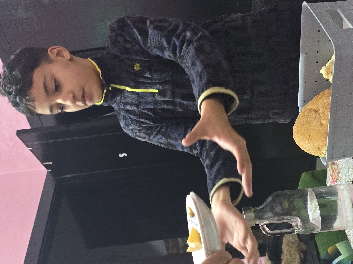 - "A boy in a patterned blue shirt reaches with his right hand for a slice of food on a white plate" by FM-Gdkzo1, licensed under CC BY 4.0