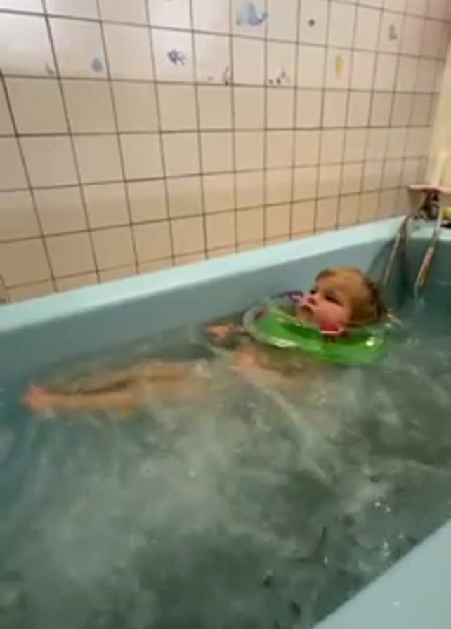 A baby floats on their back in a light blue bathtub with a green inflatable ring around their neck. The tub is filled with turbulent, bubbling water. The bathroom has white tiled walls decorated with simple ocean-themed drawings. A metal safety ladder is fixed to the side of the tub. The baby appears relaxed, moving their arms and legs gently in the water.