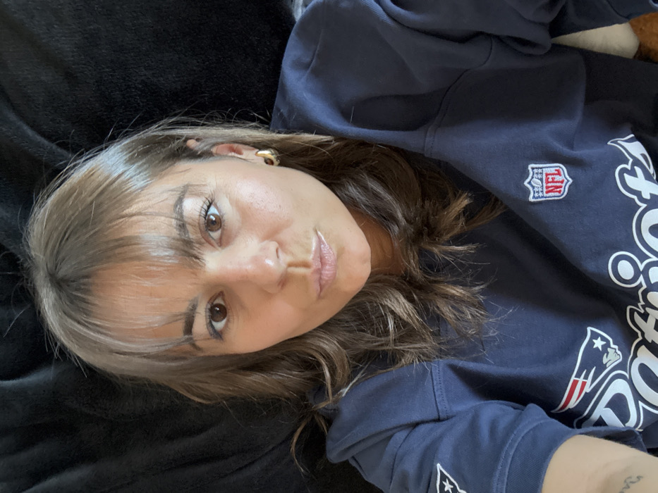 A close-up, high-angle portrait image displays a single adult female in an indoor setting within Cannes, France. The subject has medium-brown hair with bangs, brown eyes, and her lips are pursed in a puckered expression, directly facing the camera. She is wearing a navy blue long-sleeved sweatshirt featuring the white "Patriots" text and the New England Patriots logo prominently on the chest. An NFL shield logo patch is visible on the left sleeve. A small, indistinct tattoo is present on her left inner wrist. A gold-colored, teardrop-shaped hoop earring is visible in her right ear. The background consists entirely of a dark, textured fabric, providing no additional specific environmental details.