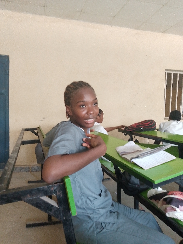 The image displays an indoor classroom or lecture hall setting in Unknown, Unknown. A young adult female, with dark skin and short, light-colored braided hair, is seated in the foreground. She wears a grey scrub-like uniform, including a short-sleeved top with a pocket and matching pants. Her mouth is open in a smile, and her gaze is directed towards the right of the frame, with her right hand positioned near her chest. She occupies a desk-chair combination featuring a black metal frame and green seat/backrest. On the green desktop in front of her, an open book or notebook is present. Behind her, other individuals are partially visible, seated at similar desks. One person in the midground wears a white top, while another further back, also in white, is seen from behind. A red and black backpack rests on a desk in the midground. The walls are light-colored, with a dark blue door visible on the left and a window with vertical security bars on the right. The ceiling consists of visible tiles.