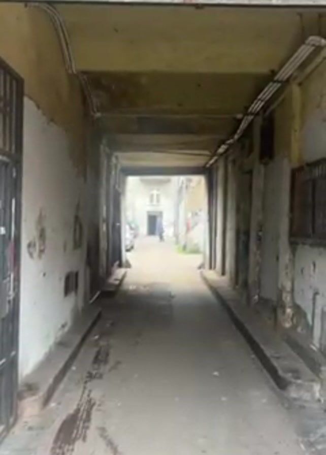 narrow, covered passageway leading to a courtyard. The passageway has weathered walls and ceiling with exposed wiring. The floor is concrete with some stains. At the end of the passageway, a person in a dark jacket is walking towards a building in the courtyard. A silver car is parked nearby. There are doorways on both sides of the passageway.