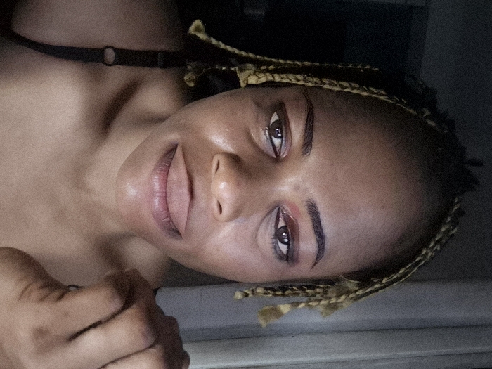 A woman with braided hair framing her face is viewed from an upside-down perspective. She has brown eyes, distinct eyebrows, and pink-tinted lips. Her skin is radiant, highlighting her cheekbones. She's wearing a thin black strap, possibly a necklace or top strap. One hand is visible at the bottom left of the frame, adding a relaxed and candid feel. The background appears dark and indistinct, drawing focus to her facial features.