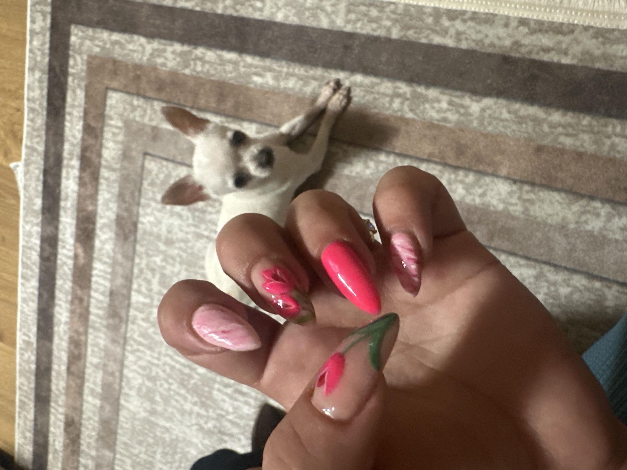 A close-up, high-angle shot focuses on a hand with elaborately decorated nails against a blurred background. The fingernails are almond-shaped and feature various designs, including solid pink, marbled pink, and floral patterns with pink tulip-like flowers and green leaves. In the blurred background, a small white dog toy lies on a beige and grey striped rug. The location and context are not discernible. There is no evidence to confirm the location is Skala, Bulgaria.