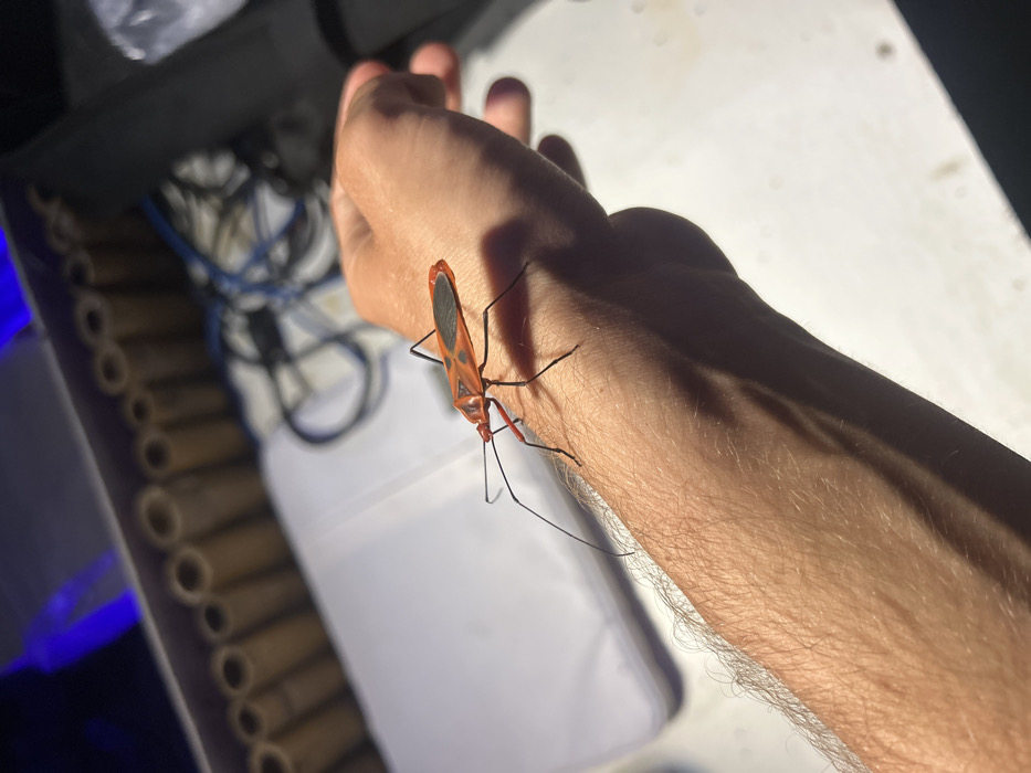 A human forearm and hand, extending horizontally from the lower left, are illuminated by a direct light source casting distinct shadows. An orange and black hemipteran insect, characterized by its elongated body, black antennae, black legs, and wings with orange and black patterns (including a prominent black scutellum), rests stationary on the dorsal surface of the hand. In the background, a white tabletop surface is partially visible to the left. Behind the hand, a linear arrangement of approximately two dozen light-brown cylindrical objects, consistent with bamboo sections, is visible. To the right of these, a tangle of blue and black electrical cables is present, alongside a dark, indistinct object on the far right. A subtle blue ambient light source or reflection is observable in the upper left background. The scene is located in Ban Mae Ping, Thailand.