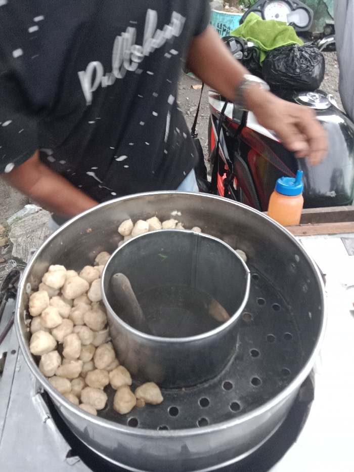 An outdoor street food stall in Semarang, Indonesia, is captured in detail. The primary subject is a large, circular, stainless steel steamer pot filled with numerous light brown, roughly spherical food items, consistent with meatballs (*bakso*). Nested within this steamer is a smaller, dark metal cylindrical container holding a dark liquid and a wooden implement, likely a pestle or serving utensil, partially submerged. A person, identified as the vendor, is visible from the chest upwards on the left, wearing a black short-sleeved t-shirt with white abstract patterns or text. Their right arm, adorned with a wristwatch and a visible tattoo on the forearm, extends towards a small orange squeeze bottle with a blue dispenser cap, positioned on a surface next to the steamer. In the background, portions of a black and red motorcycle, including its fuel tank and dashboard, are visible, draped with a green cloth and a black plastic bag. The ground is a rough, light-colored paved surface, indicating an urban street environment.