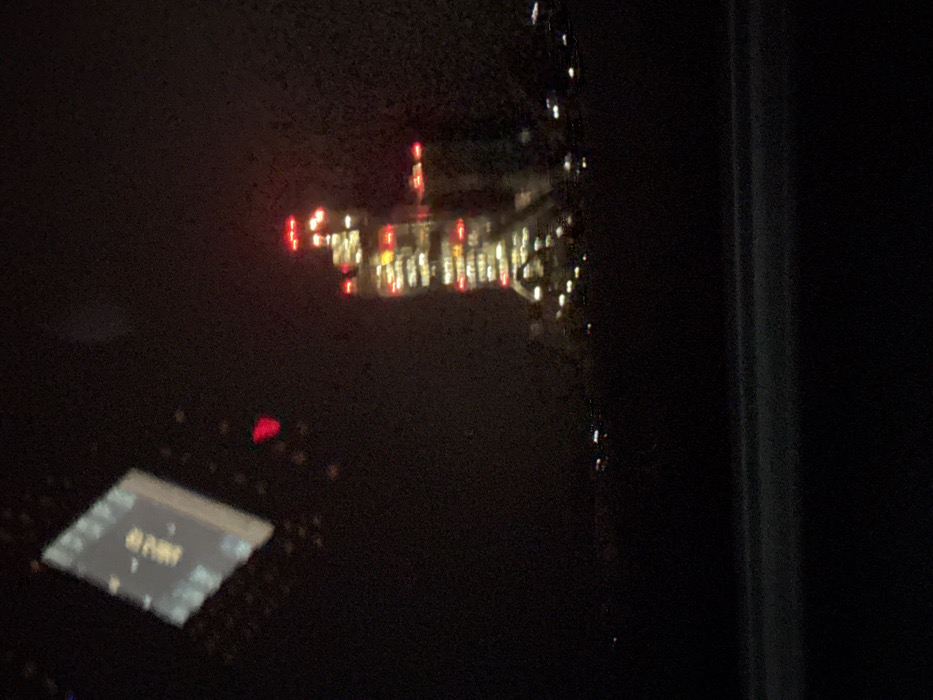 The image displays a nighttime scene in Devnya, Bulgaria, characterized by low light and a prominent, illuminated distant structure. The dominant feature is a tall, multi-story building located in the mid-right frame, appearing distant and slightly out of focus. This structure is extensively lit with internal white and yellow lights visible through numerous windows, giving it a glowing appearance against the dark backdrop. Red warning lights are distinctly visible on the upper sections and along the edges of the building, indicating its height or industrial function. The building's form is complex, featuring multiple interconnected blocks and varied elevations. The foreground is predominantly dark and featureless, suggesting an unlit road or open terrain, with a faint horizontal line separating it from the slightly brighter area directly below the main building, where subtle glimmers of distant ground-level lights can be observed. In the upper left quadrant of the image, a rectangular, illuminated reflection is present, displaying digital characters, including what appears to be "46:70" along with other indistinct symbols. Adjacent to this reflection, a small, distinct red indicator light is visible. These internal reflections suggest the photograph was taken from within a vehicle or enclosed space. The overall environment is dark and industrial, consistent with night conditions in Devnya. No individuals are discernible in the scene.
