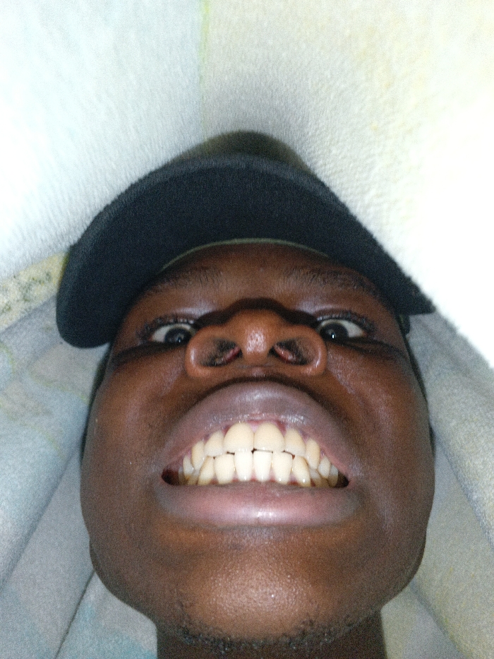 A close-up, upward-angled shot of a dark-skinned person wearing a black cap. The focus is on their wide smile, displaying a full set of white teeth. Their nose is prominent and centered, with both nostrils visible. The person's eyes are wide open and looking upward. The background consists of a blurred, light-colored, possibly textured surface. The overall image is unconventional due to the unusual angle and extreme proximity.
