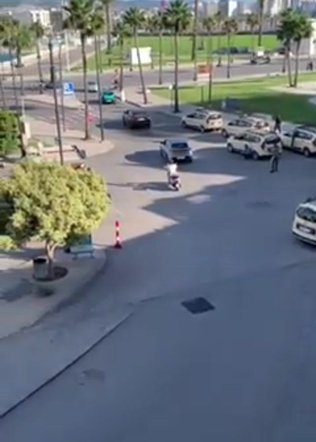 The video presents a high-angle view of a street intersection in what appears to be a city near a coastal area. Palm trees line the street and a green park space can be seen. The weather is sunny and clear. Several cars are visible, including a line of what appear to be taxi cabs. A person is riding a scooter through the intersection. Another person is standing on the sidewalk wearing a red jacket. Two construction cranes can be seen in the background. A woman in traditional clothing is walking across the street. A small tree is in the foreground.