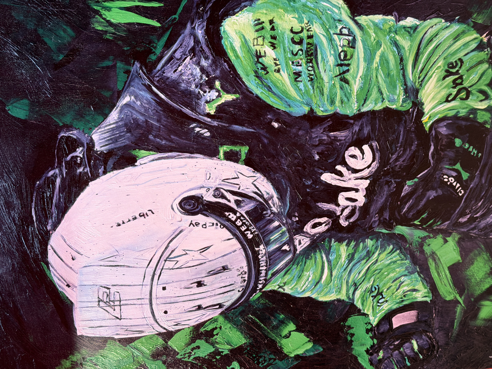 The image is a painting of a race car driver in full gear. The driver is wearing a white helmet with several company logos including "RicPay" and "Liberty" visible. They are wearing a black racing suit with green accents and names like "Alepp" and "Sake" written on it, along with company names like "MESCC WORKWEAR" and "WEBIN EYE WEAR". The helmet is to the left, and the suit is bunched up on the right, indicating the artist's attempt to capture the texture and movement of the fabric. The background is a mix of dark green and black hues. The painting appears to be done in an expressive style, with thick brushstrokes and bold colors. There is no information about Dospey, Bulgaria.