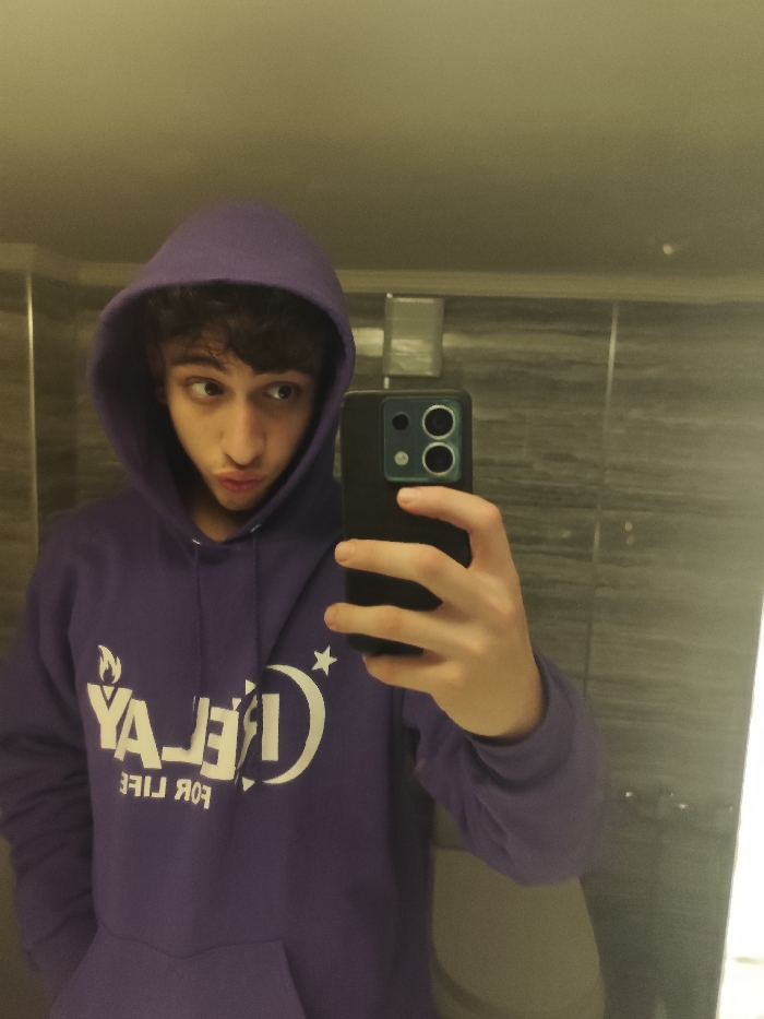 A young man in a purple hoodie takes a selfie in a bathroom. The hoodie has the text "RELAY FOR LIFE" in reverse, along with an image of a candle and star. He's wearing the hood up. His expression is slightly puckered. Behind him is a marble-patterned wall and part of a toilet is visible in the lower right corner. He is using a phone with two prominent circular camera lenses.