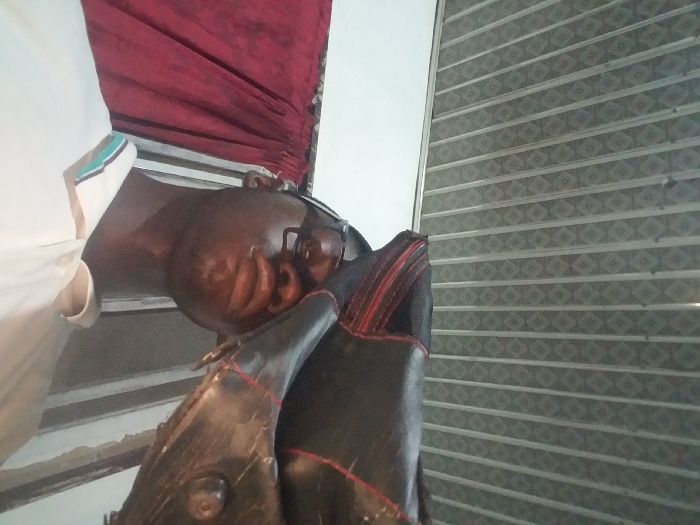 A person with dark skin wears glasses and a white shirt with a blue stripe. A dark bag or case with red detailing rests near the person. Red fabric is draped in the background. The photograph is taken at an angle, showing a wall with a striped pattern to the right. The lighting is bright, though some shadows are present.