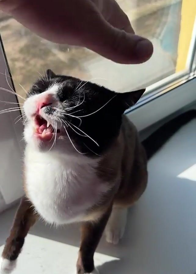 A medium shot shows a cat standing on its hind legs on a window ledge, with its paws reaching upward against the glass. The cat has black and brown fur, with a white chest and a pink nose. It has long white whiskers and mismatched eyes, one blue and one brown. Its mouth is open, as if meowing. A human hand reaches into the frame and pushes the cat’s head, prompting the cat to stretch up against the window. The backdrop shows a blurred exterior, possibly a sports field with a bright color scheme. The window frame is white, and the cat is brightly lit from the side.