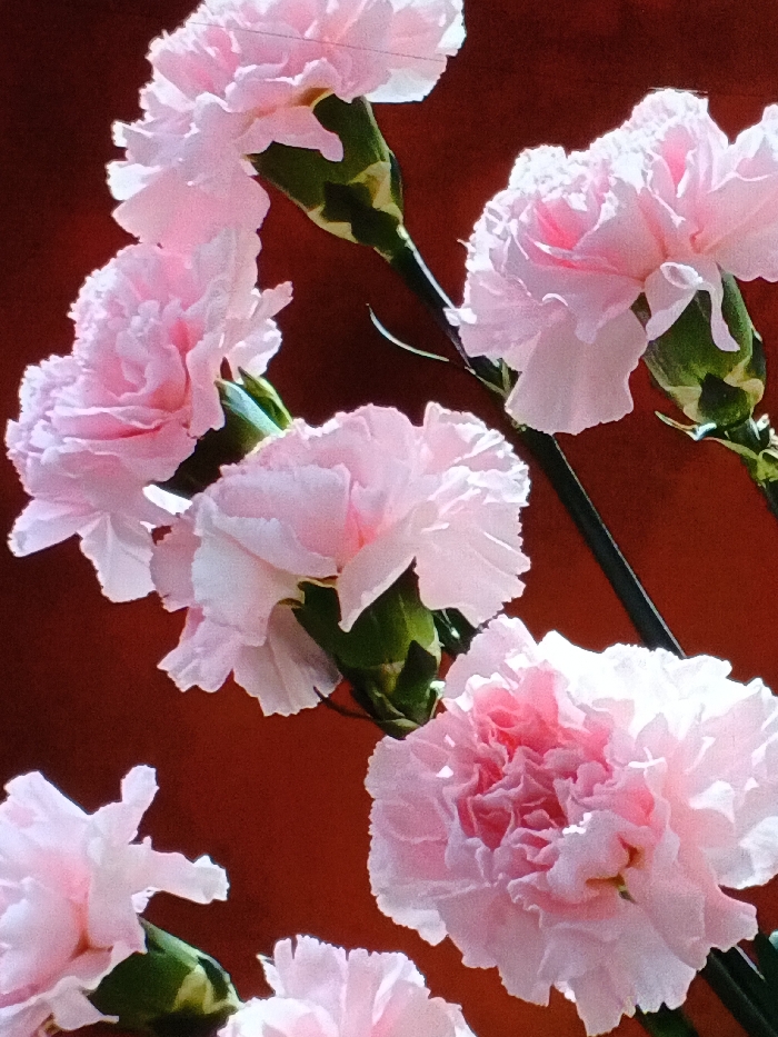 - "Several pink carnations bloom against a deep red background" by FM-7Fd812, licensed under CC BY 4.0